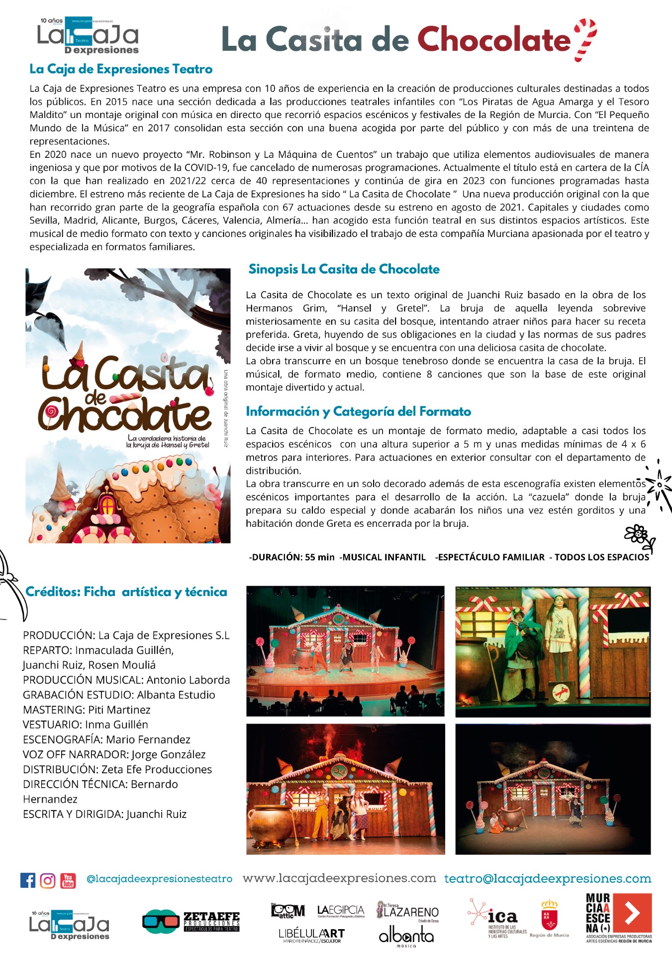 La Casita de Chocolate es la obra con más éxito, hasta el momento, de la Caja de Expresiones Teatro. Más de 60 actuaciones por toda la geografía española avalan esta versión del famoso cuento de los Hermanos Grim. Un montaje divertido y familiar con canciones originales.
